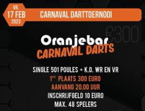 Oranjebar Carnavals Darttoernooi 2023 start dit jaar op de vooravond van het Carnavalsfeest in Mariahout. Vrijdag 17 november om 20:00 uur kunnen maximaal 48 deelnemers gaan strijden voor de 1e prijs van €300,=.