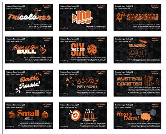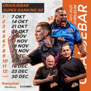 Oranjebar viert jubileumfeest voor tijdens de 50e editie van de Oranjebar Super Ranking. Iedere speelweek met een extra kans voor de deelnemers om een prijs te winnen met de 3-Darts challenge. vanzelfsprekend zijn er ook dagprijzen, rankingpunten voor de finaledag en de inhoud van de Mysterie Box te verdienen.